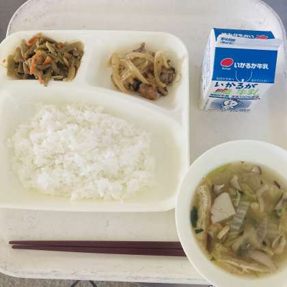 今日の献立は、ご飯、牛乳、鶏肉の梅風味焼き、うすくず汁、きんぴらごぼうでした。