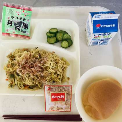 今日の献立は、ミニコッペパン、牛乳、和風焼きそば、きゅうりのしょうがづけ、ソフト黒豆でした。