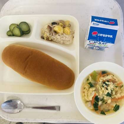 今日の献立は、黒糖パン、牛乳、中華おこわ、たまごスープ、きゅうりのピリ辛あえでした。