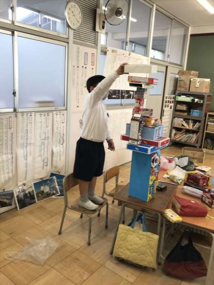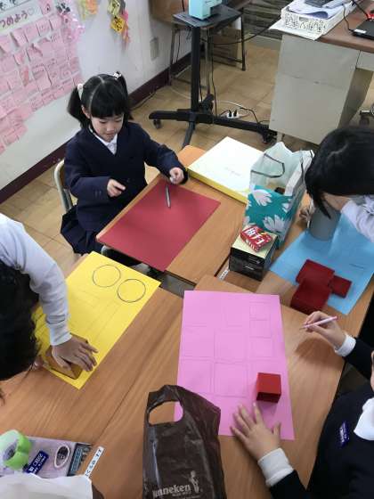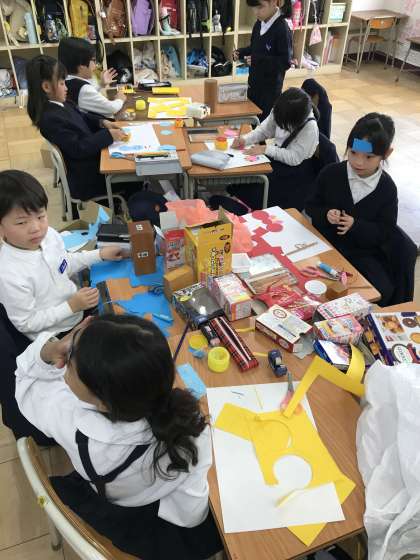 算数科の「はこのかたち」の学習では、箱の形を写し取ったり、積み上げたりする中で、それぞれの箱の形の特徴に気づくことができました。今はその空き箱を使って工作をしています。大きな箱もたくさん持ってきて、作りたいものをどんどん作って、目一杯楽しんでいます。たくさんの箱を集めて持たせてくださり、ありがとうございました。