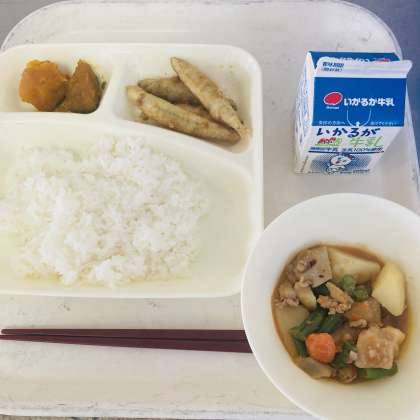 今日の献立は、ご飯、牛乳、きびなご天ぷら、含め煮、焼きかぼちゃの甘みつかけでした。