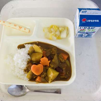 今日の献立は、牛乳、金時豆のカレーライス、白菜のピクルス、棒チーズでした。