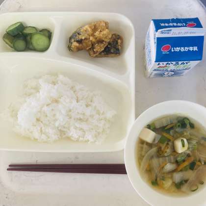 今日の献立は、ご飯、牛乳、さばのカレーたつた揚げ、五目汁、きゅうりの甘酢あえでした。