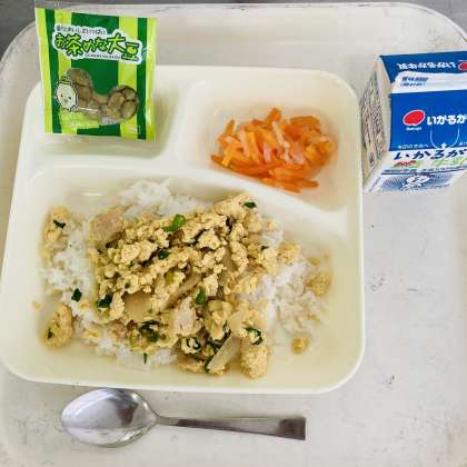 今日の献立は、牛乳、親子丼、紅白なます、抹茶大豆でした。
