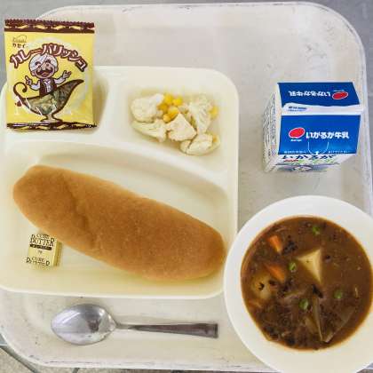 今日の献立は、コッペパン、牛乳、ビーフシチュー、カリフラワーとコーンのサラダ、カレーフィッシュ、バターでした。