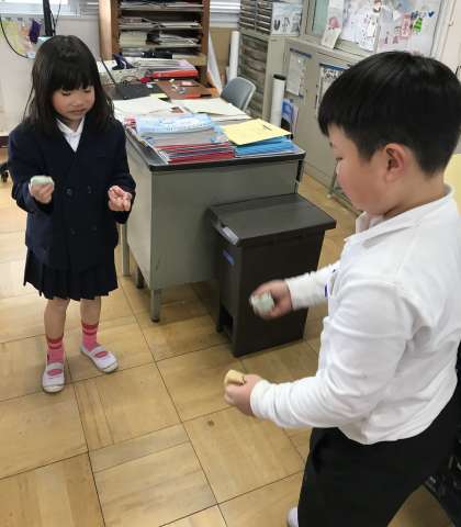 少しずつ新しい遊びに挑戦しています。けん玉やお手玉は、休み時間にも練習しているお友達がたくさんいます。お家でもできそうな遊びがありましたら、ぜひ一緒に取り組みながらコツを教えてあげてください。