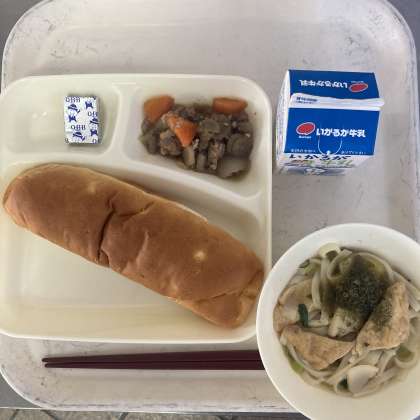 今日の献立は、おさつパン、牛乳、豚肉とごぼうの煮物、なにわうどん、固形チーズでした。