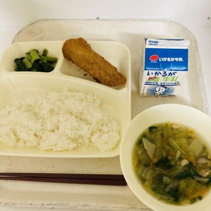 今日の献立は、ご飯、牛乳、たらフライ、うすくず汁、小松菜のごまあえでした。