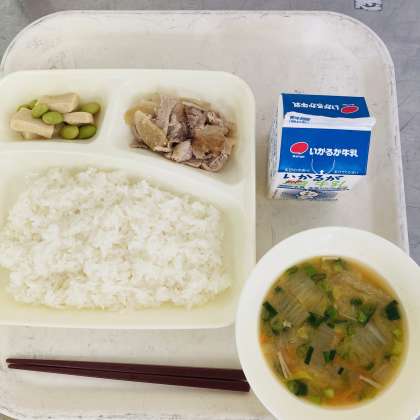 今日の献立は、ご飯、牛乳、豚肉のしょうが焼き、みそ汁、高野豆腐の煮物でした。