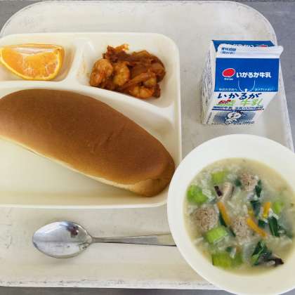 今日の献立は、黒糖パン、牛乳、えびのチリソース炒め、中華がゆ、デコポンでした。