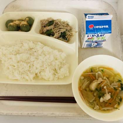 今日の献立は、ご飯、牛乳、豚肉と野菜の炒めもの、五目汁、よもぎだんごでした。