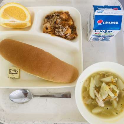 今日の献立は、コッペパン、牛乳、豆腐のミートグラタン、じゃがいもと野菜のスープ、はっさく、バターでした。