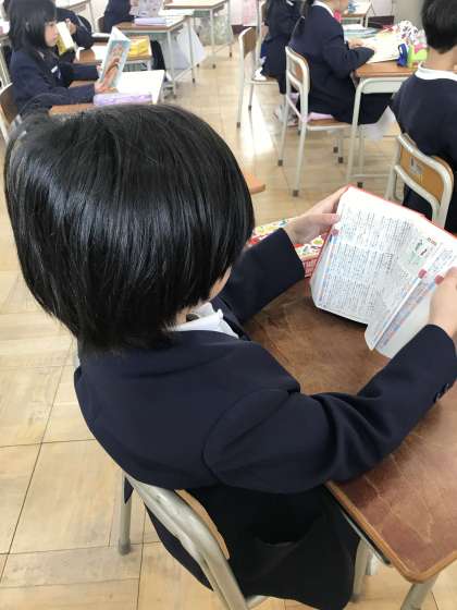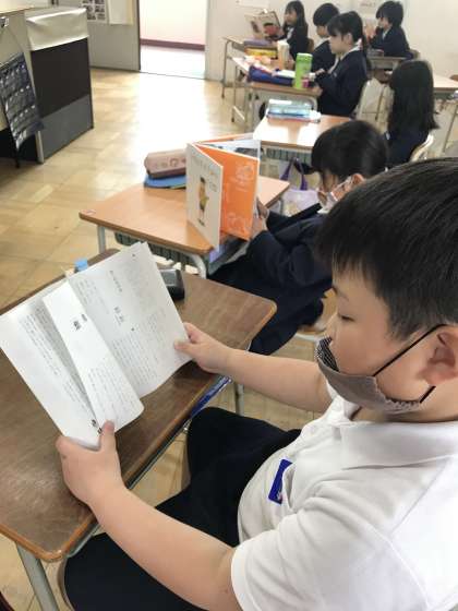1年生は読書が大好きで、読んだ本を読書カードに記録しながら、図書の時間だけではなく教室でもよく読んでいます。最近は、大阪市の小学生の作文集「大阪の子」を読んだり、国語辞典を読んだりしている姿も見られます。「ことバト」という言葉集めゲームで勝つために、いろいろな言葉を集めています。