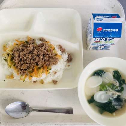 ビビンバは、子どもたちに大人気のメニューです。切り干し大根、きゅうり、にんじんを使用したナムルと甘辛く味付けしたひき肉をご飯と混ぜていただきます。肉、野菜、ご飯を一度に食べることができ、栄養バランスのよい一品です。