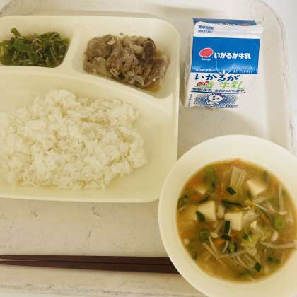 今日の献立は、ご飯、牛乳、豚肉のしょうが焼き、豆腐のみそ汁、じゃこピーマンでした。