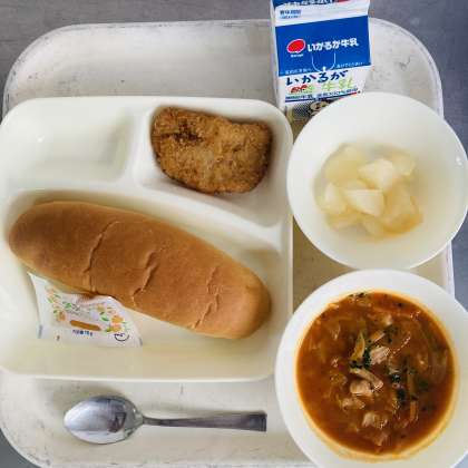 今日の献立は、コッペパン、牛乳、トンカツ、ミネストローネ、和梨の缶詰、アプリコットジャムでした。