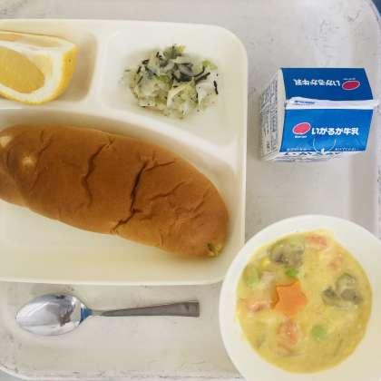 今日の献立は、おさつパン、牛乳、鶏肉とコーンのシチュー、キャベツのひじきドレッシング、かわちばんかんでした。