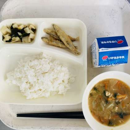 今日の献立は、ご飯、牛乳、きびなご天ぷら、みそ汁、わかたけ煮でした。