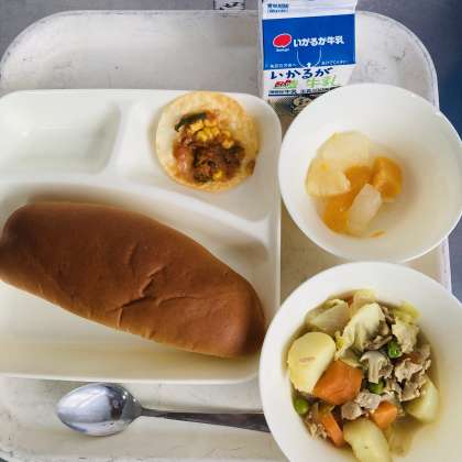 今日の献立は、黒糖パン、牛乳、豚肉と野菜のカレースープ煮、変わりピザ、ミックスフルーツ(缶)でした。