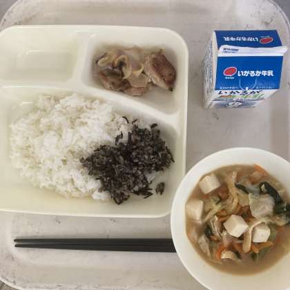 今日の献立は、ご飯、牛乳、鶏肉の甘辛焼き、みそ汁、魚ひじきそぼろでした。
