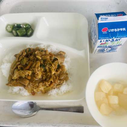 今日の献立は、牛乳、和風カレー丼、オクラの甘酢あえ、和梨の缶詰でした。