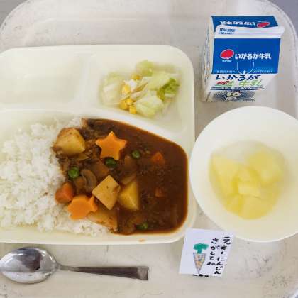 今日の献立は、牛乳、ハヤシライス、キャベツとコーンのサラダ、りんご(カット缶)でした。