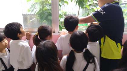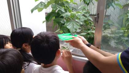 朝、さなぎから一匹アゲハになっているのを児童が発見!みんなで…窓から元気に飛んでいくのを見守りました。「元気でねー!」「沢山みつをすって大きくなってねー!」と、はげまして見送る姿がとても、ほほえましかったです。