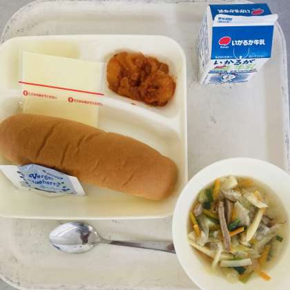 今日の献立は、コッペパン、牛乳、えびのチリソース、中華スープ、スライスチーズ、ブルーベリージャムでした。