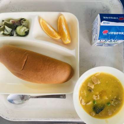 今日の献立は、パンプキンパン、牛乳、鶏肉とかぼちゃのシチュー、ミックス海草のサラダ、オレンジでした。