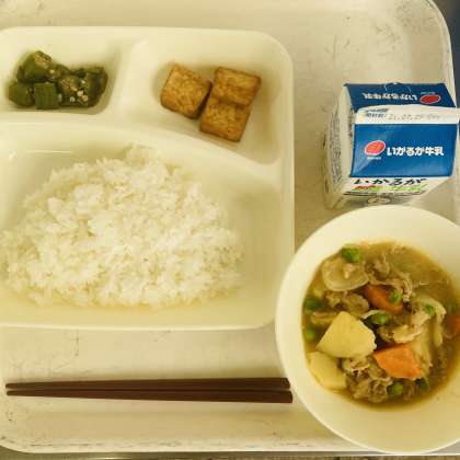 今日の献立は、ご飯、牛乳、みそ肉じゃが、厚揚げのしょうがじょうゆかけ、オクラのおかか炒めでした。
