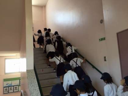 9時47分に近畿地方に大きな地震が発生したという想定で避難訓練を行いました。揺れが収まったところでまずは校庭東に避難、続いて津波警報が発令されたという想定で、安全が確認された2号、3号階段を通って4回廊下に避難しました。