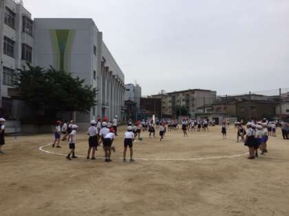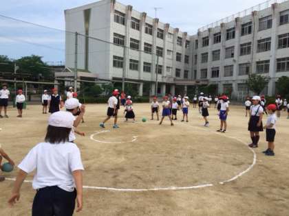 児童集会でたてわり班に分かれ、転がしドッジボールをしました。集会委員会のみなさんが実際にやって見せてルールを教えてくれたように、転がってくるボールに当たるとアウトです。狭い円の中でいくつものボールが転がってくるので、油断すると当たってしまいます。1年生から6年生までけっこう盛り上がりました。