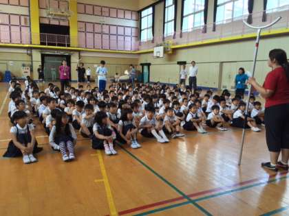 3時間目の途中に不審者が校内に入ったという想定で避難訓練を行いました。あの教育大付属池田小の事件から15年が経ちましたが、尊い教訓を忘れることなく、子どもたちの大切な命を守るために本校では毎年避難訓練を行っています。写真は、教室への緊急避難の後、「不審者を確保しました」という放送で訓練のまとめをするために体育館に集合しているところです。