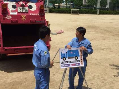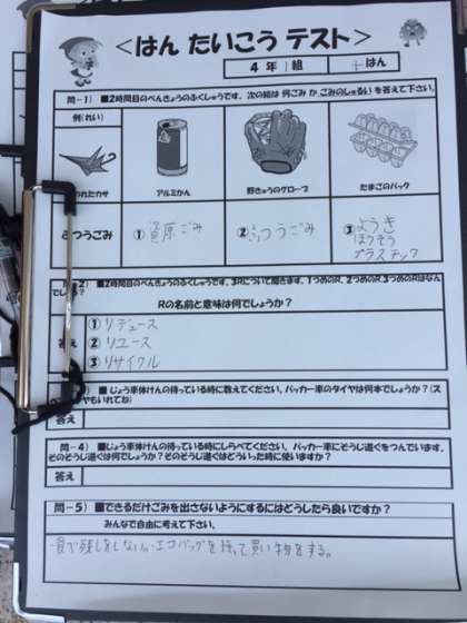 4年生が社会科の授業で、環境事業局の方々に来ていただいて、ごみのことや3R(レデュース(ごみを減らす)・リユース(使い捨てず繰り返し使う)・リサイクル(形を変えて再利用する))の大切さについてクイズ形式で楽しく学んだあと、パッカー車の試乗をしました。ごみも地球上の大事な資源のひとつです。むだにせず、有効に使いたいものです。