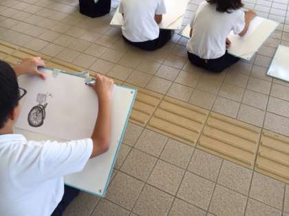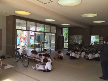 2時間目、4年生は図画工作で、学校の玄関にある自転車の写生をしました。コンクールに応募するというめあてをもって、みんな集中して書いていました。