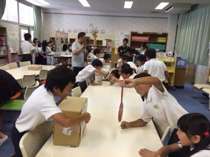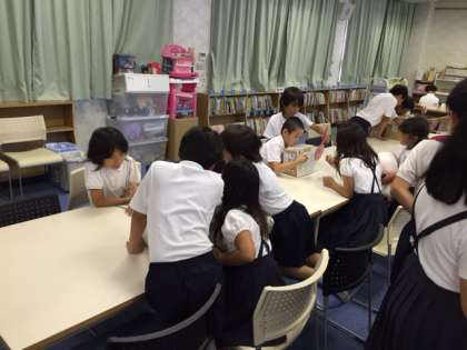 図書室ではミラー迷路をしました。箱の側面に迷路を貼り、友だちに手鏡で写してもらいながら、迷路を解くゲームです。