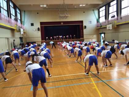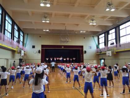 今日の児童集会は、全校児童でラジオ体操の練習をしました。運動委員会のみなさんがステージでお手本を見せてくれたので、1年生もじょうずにできました。夏休みのラジオ体操もこの調子でみんな参加してください。