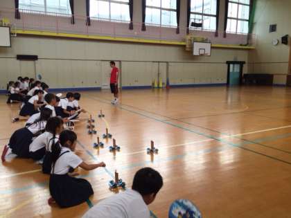 少しでも正確に実験できるように窓を閉めた体育館は蒸し暑かったですが、みんな目的を理解してがんばりました。風の強さや方向、車の進む方向など、競争しながら楽しく調べていました。風はいわゆる再生可能エネルギーのひとつで、古来から船の動力としてつかわれており、最近では風力発電に利用されていますね。3年生の中からすばらしい使い道を発明してくれる人がでてきてくれるとうれしいです。
