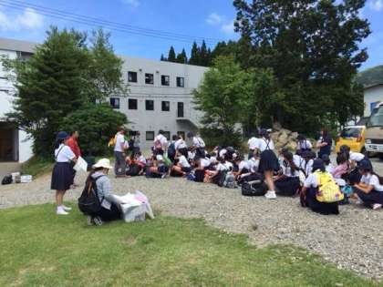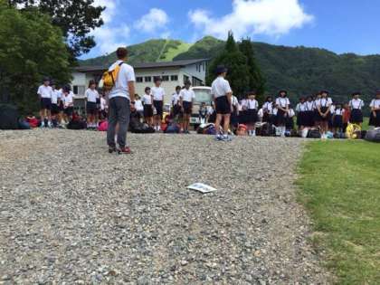 ただ今、ハチ高原ヒュッテやまなみに到着しました。入山式をしています。全員が楽しい林間学舎にしましょう。