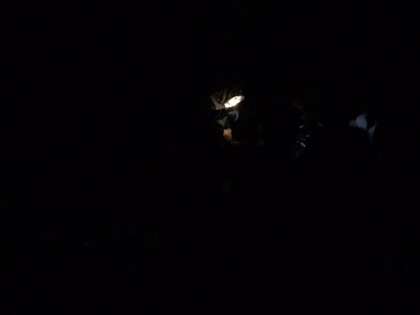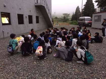 夕食後、先生が体験した不思議な話をみんなで聞きました。ちょっぴり怖くなったところで、陽も落ち、ナイトハイクに出発!怖さを紛らわせるために、歌を歌う班もありました。他校の先生がオバケに扮して立っておられたので、写真をとりましたが、わかるでしょうか。このような暗闇の中をランタンの光を頼りに、縦わり班で歩きました。