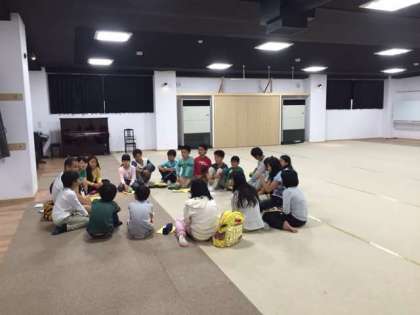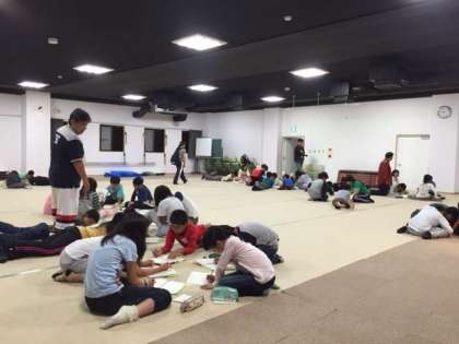 3階の大ホールで、班別に今日の振り返りをしています。今日一日がんばったこと、明日がんばりたいことを話しあいながらしおりに書いています。また、今日のMVPとしてがんばったり助けてくれた友達の名前も挙げていました。最後に班長と室長会議をして、今日は9時40分就寝です。