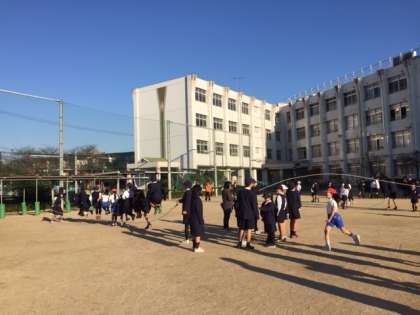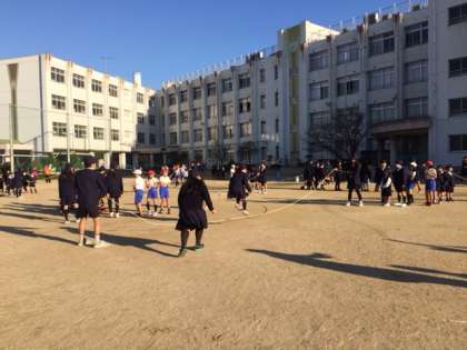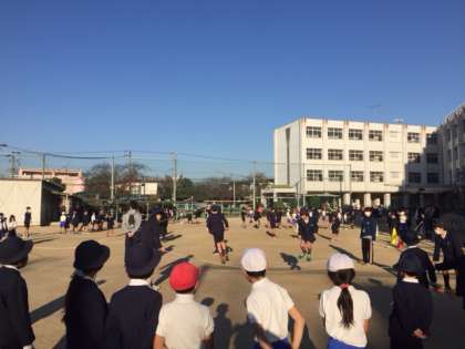 児童集会で、たてわり班に分かれて長なわとびをしました。高学年の子どもたちが、低学年の子でも安心して飛べるよう、工夫をしてなわを回していました。今朝は少し冷え込んでいましたが、子どもたちは元気いっぱいになわとびを楽しんでいました。