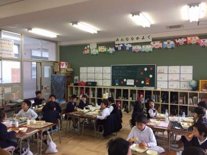 今日は1年1組5班のみなさんと一緒に給食をいただきました。みんな、楽しそうによくしゃべり、よく食べます。