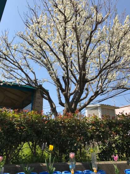 ようやく季節にふさわしい あたたかな日となった今日、平成29年度の新体制をスタートしました。7日の入学式には、桜の花も咲いてくれることでしょう。写真はすももの花です。旧2年生たちが植えたチューリップも咲き始めています。