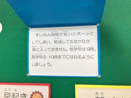 早寝・早起き・朝ごはんは健康の源!というわけで、保健室の先生が掲示を作ってくれました。絵をめくると、説明が書いてあります。夜寝ている間に、骨が作られて背が伸びるとよく言われますが、最近の脳科学の研究では、睡眠が不足すると「海馬」という、学習記憶をつかさどる部分が大きくなれないそうです。
