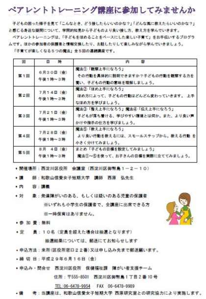 西淀川区 保健福祉課より、「ペアレント・トレーニング講座」の案内が届きました。講師は、以前大阪市で小学校の先生を何年もされた後、こども相談センターで、学校に適応しづらい子どもたちに支援をしてこられた 西原弘さん(現和歌山信愛女子短期大学講師)です。経験に基づいた豊富な事例を引き合いに出して話をされるので、とてもわかりやすく、楽しい講座です。