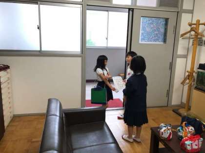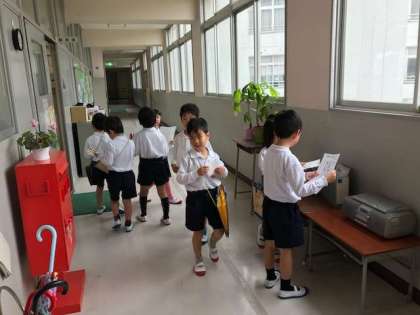 1時間目に、1年生が2年生に案内してもらって、学校探検をしました。生活科の授業です。