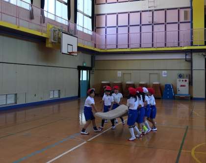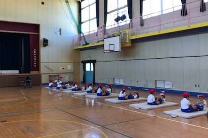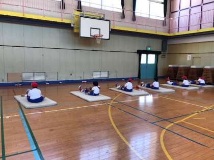 2時間目に、1年生が「上体おこし」と「立ち幅とび」の記録を測定しました。マットも初めて自分たちで運びました。どんどん小学生らしく、成長していっています。