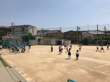 初夏の日差しがまぶしい校庭で、子どもたちが元気に遊んでいます。今日はお昼休みに代表委員会の集まりがあったので、校庭は中学年と低学年の貸切状態でした。