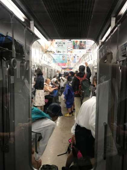 6年生が全員揃って、伊勢志摩方面に向かって出発しました。電車の中は、例年より空いています。ただいま、難波につきます。